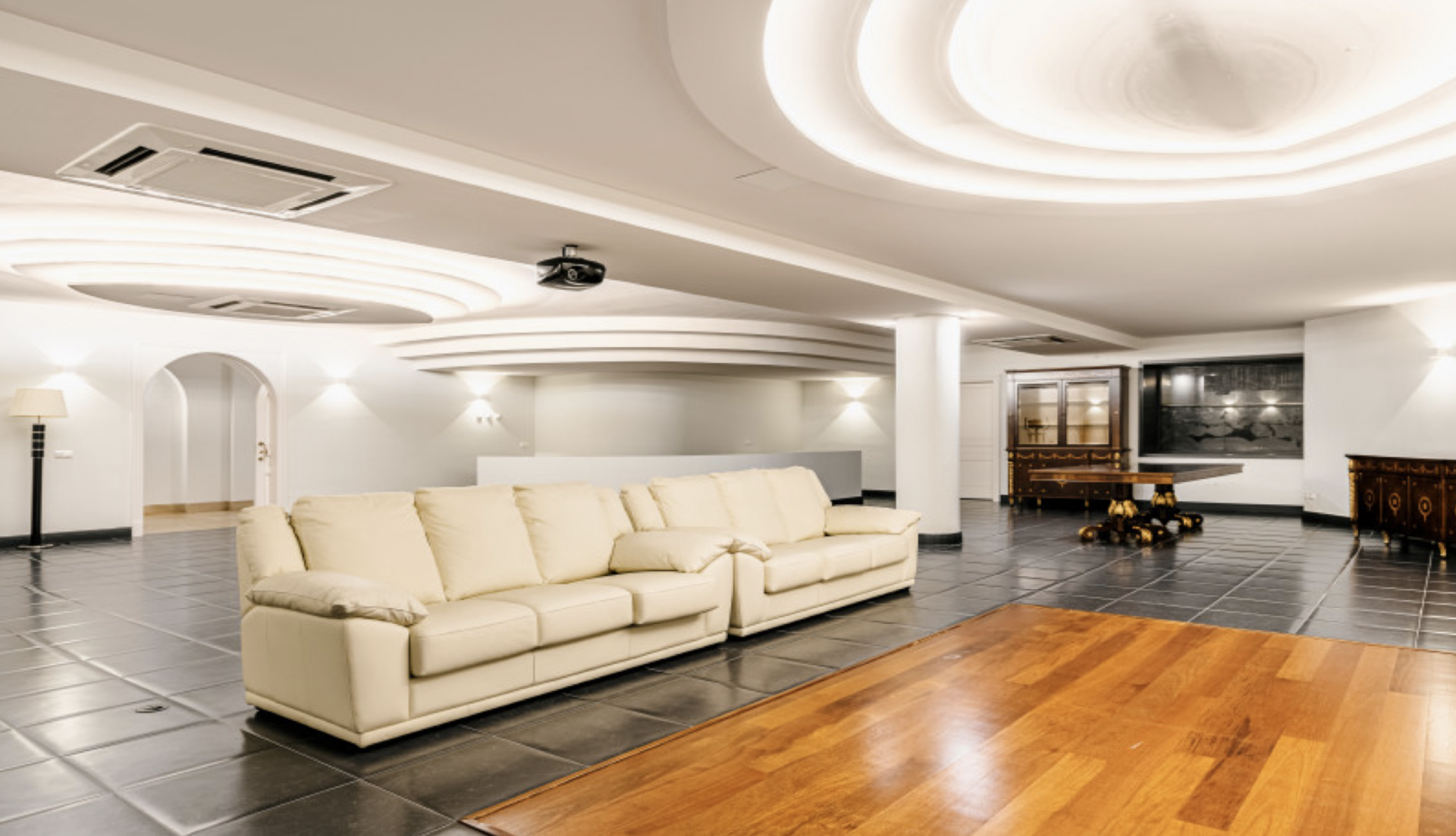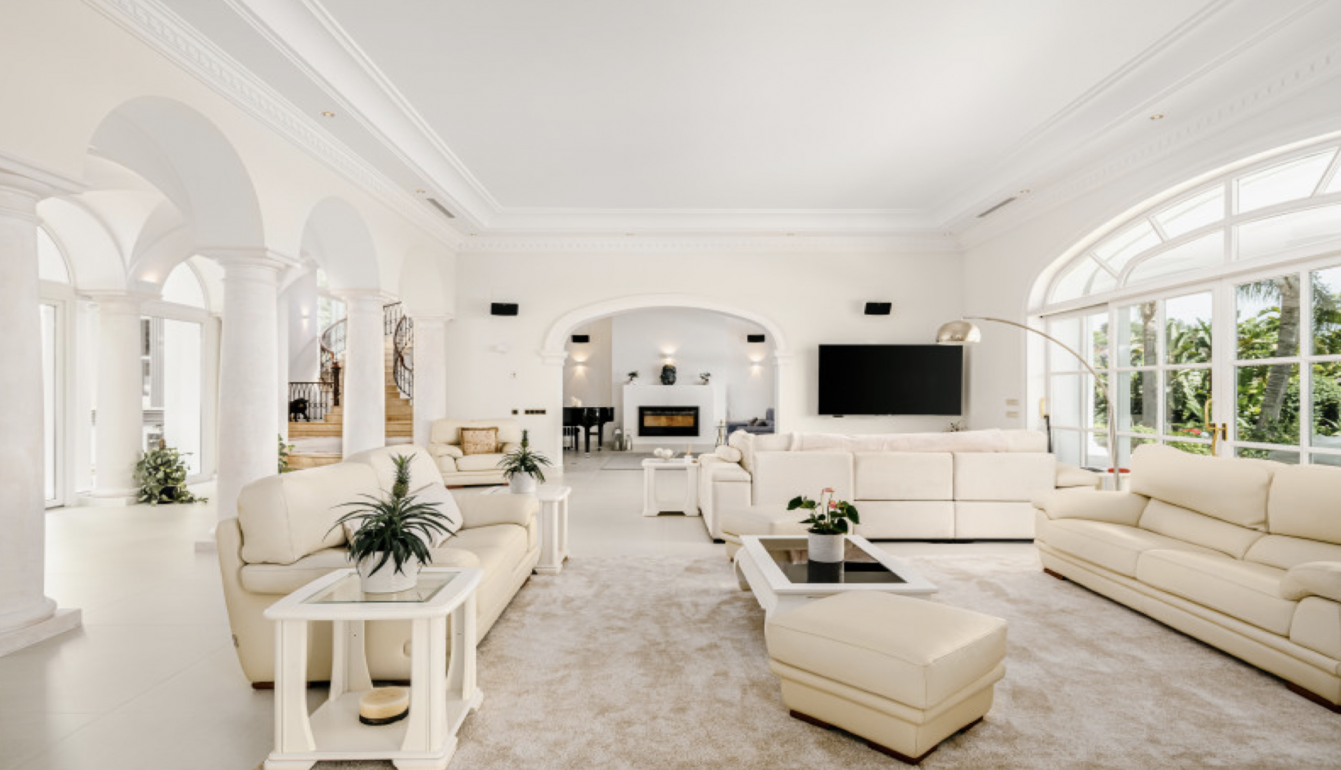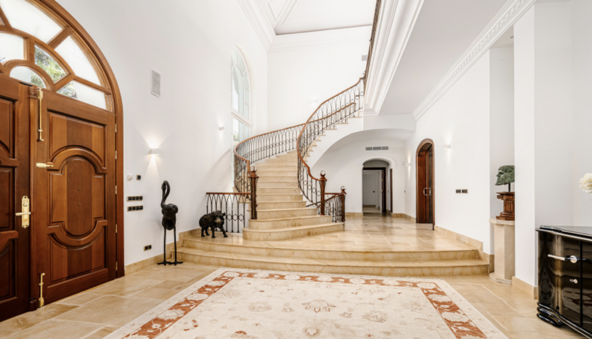 The property features six bedrooms plus staff quarters, expansive terraces, Bourgogne limestone and marble floors, individual underfloor heating, air conditioning and media system throughout. Furthermore, an entertainment room with bar, dance floor, cinema projector, retractable screen and a window overlooking the koi carp pond, a gym, a wet and dry sauna, a temperature-controlled wine cellar, a large study with access to the garden, a four-car garage and a staff apartment with separate entrance.