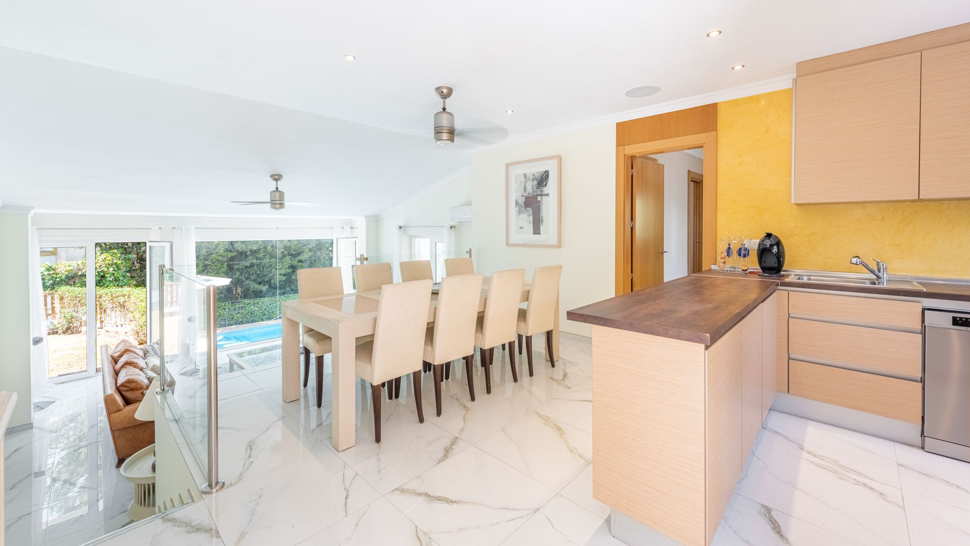 The entrance hall leads to the dining room with open-plan modern kitchen and the living room. From the living room you have direct access to the garden and the pool.
