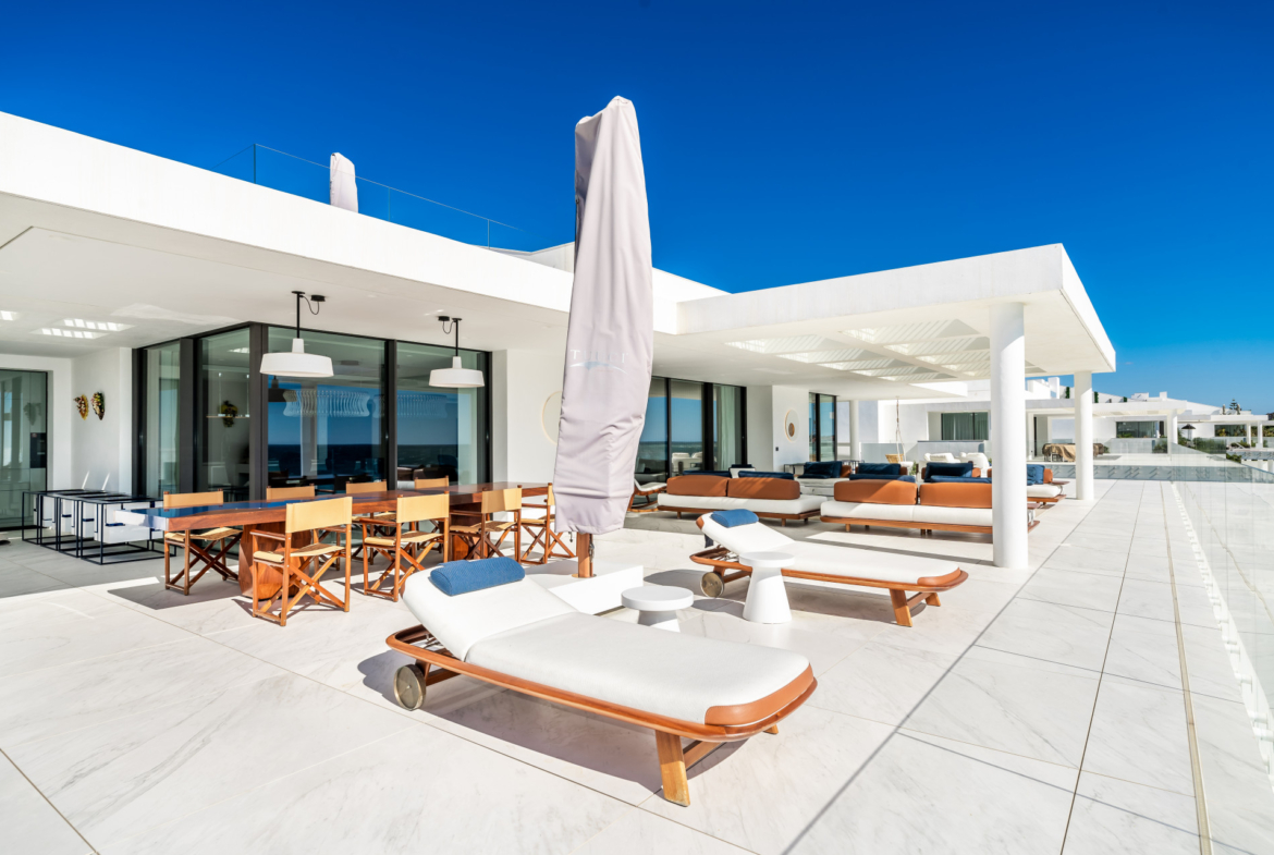 Beeindruckende Gärten in modernem Stil, aber mit mediterranem Flair. Die meisten dieser Gärten erstrecken sich wie eine große grüne Wiese zwischen der Residenz und dem Meer, wo es ein neues Konzept eines beheizten Außenpools, mit Chlorierung, mit Überlauf und mit einem "Infinity"- und "Bajo Shelf"-Bereich.