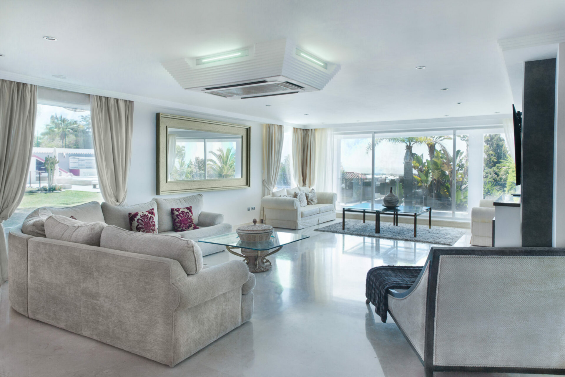 Das geräumige, helle und luftige Wohnzimmer vermittelt ein Gefühl von Frische, Ruhe und Luxus mit einigen extravaganten Extras wie einem Tagesbett, einem Kamin und einer Bar.